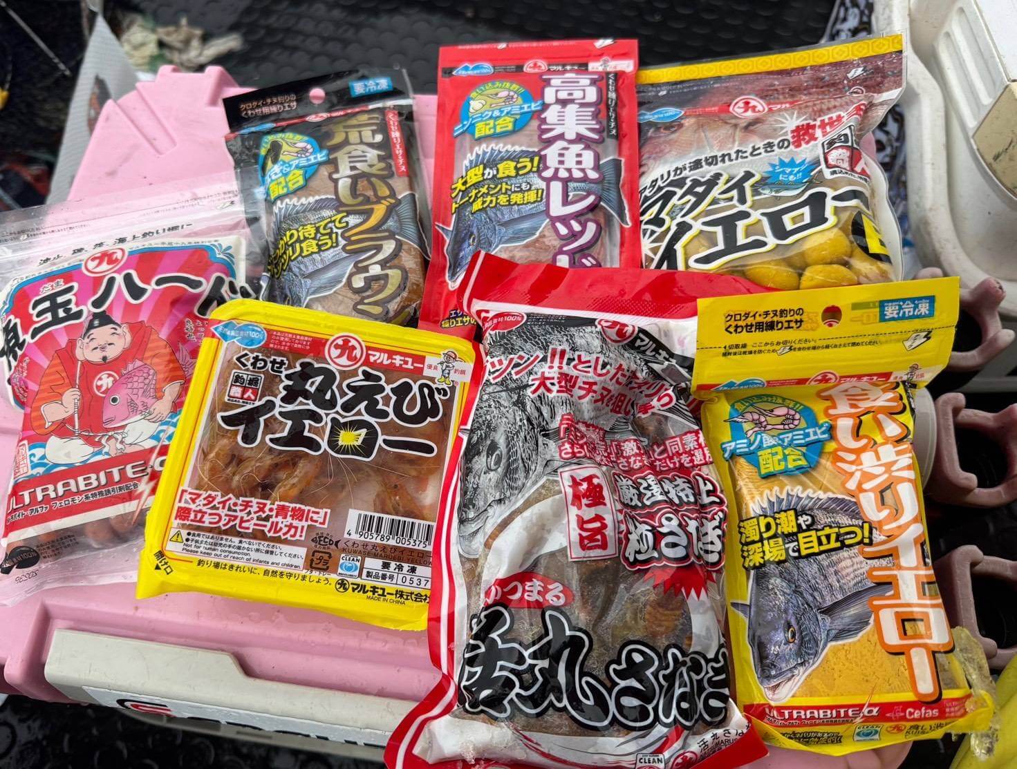 付けエサ:「くわせ丸えびイエロー」 「魚玉ハード」 「活丸さなぎ」 「食い渋りイエロー」 「マダイイエロー」 「荒食いブラウン」 「高集魚レッド」