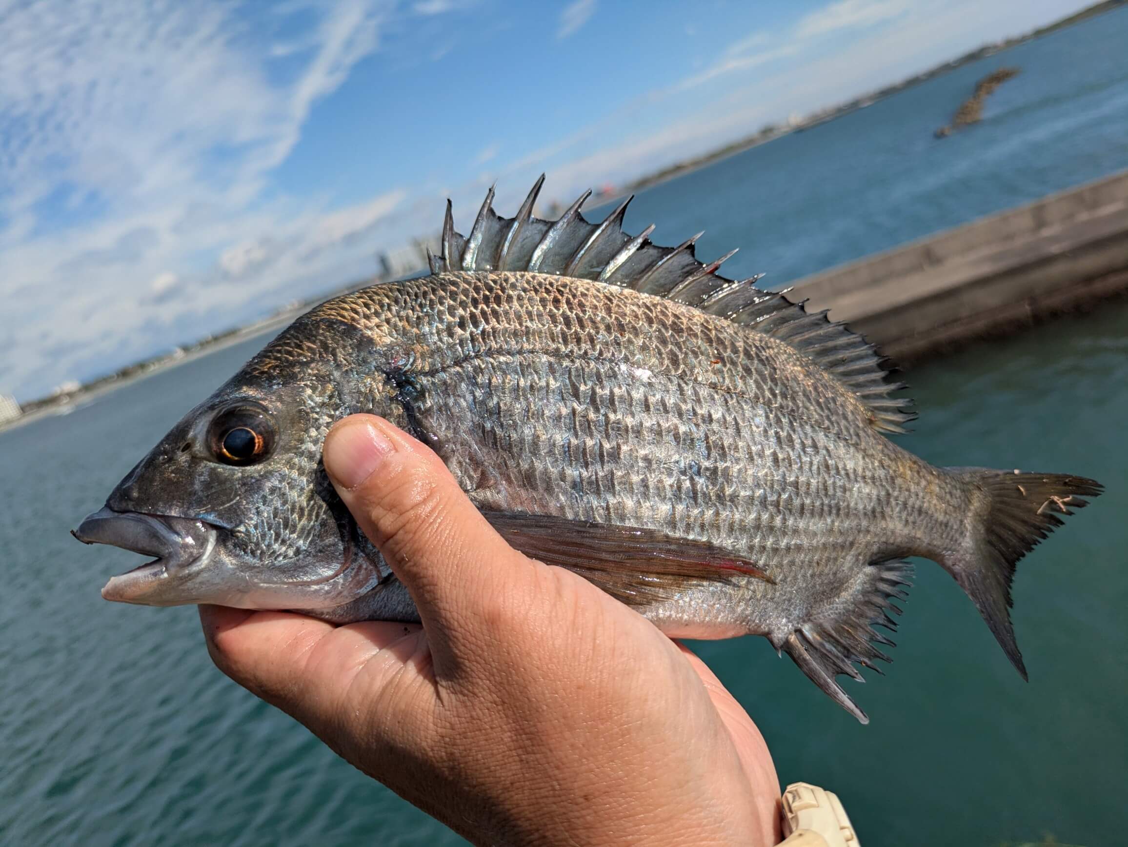 手前のフグゾーンを諦め遠投し沖からヒットポイントに仕掛けを誘導する作戦で本命チヌをゲットできました。