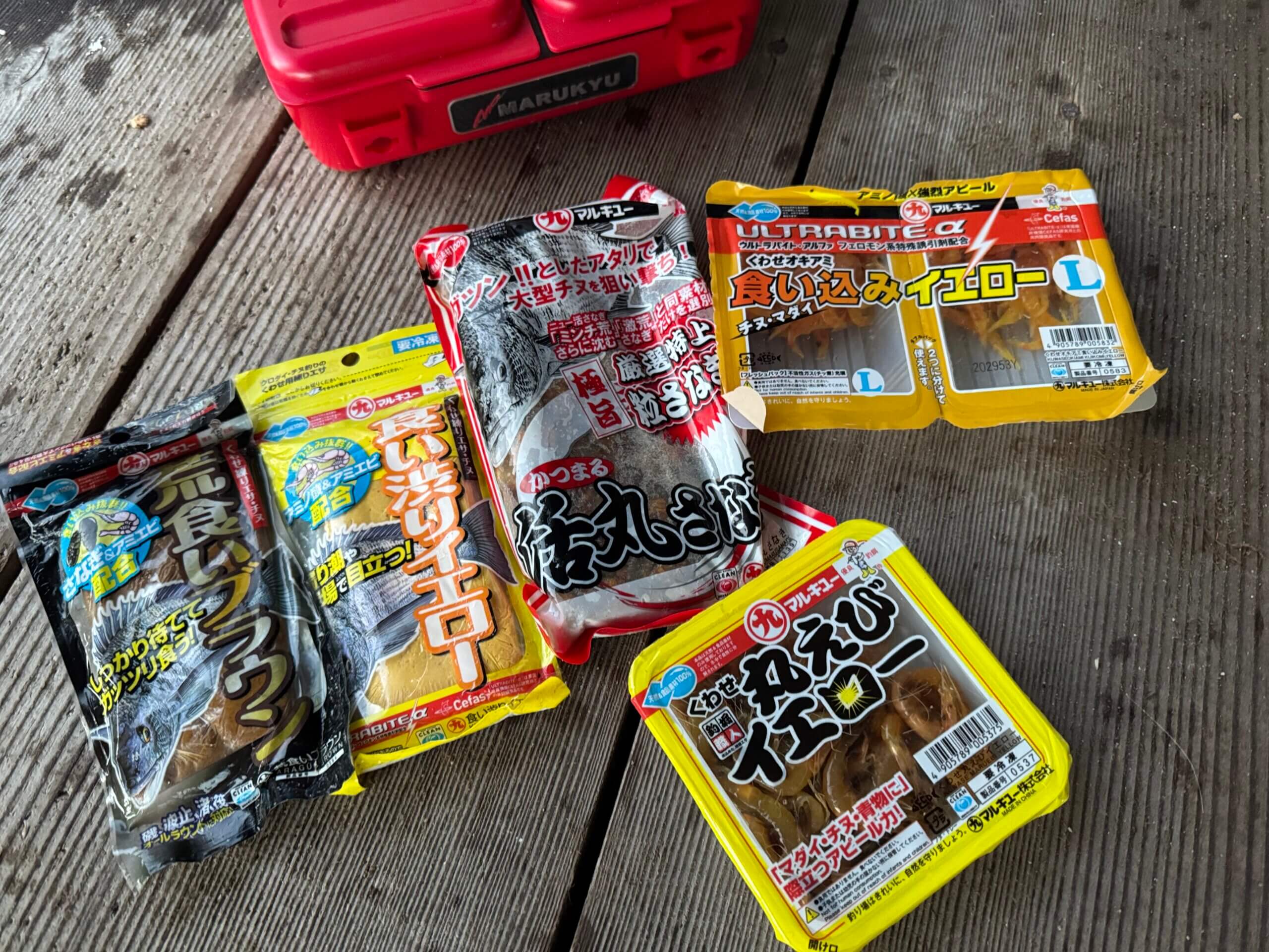 付けエサ:「くわせオキアミ食い込みイエロー」 「食い渋りイエロー」 「荒食いブラウン」 「活丸さなぎ」 「くわせ丸えびイエロー」