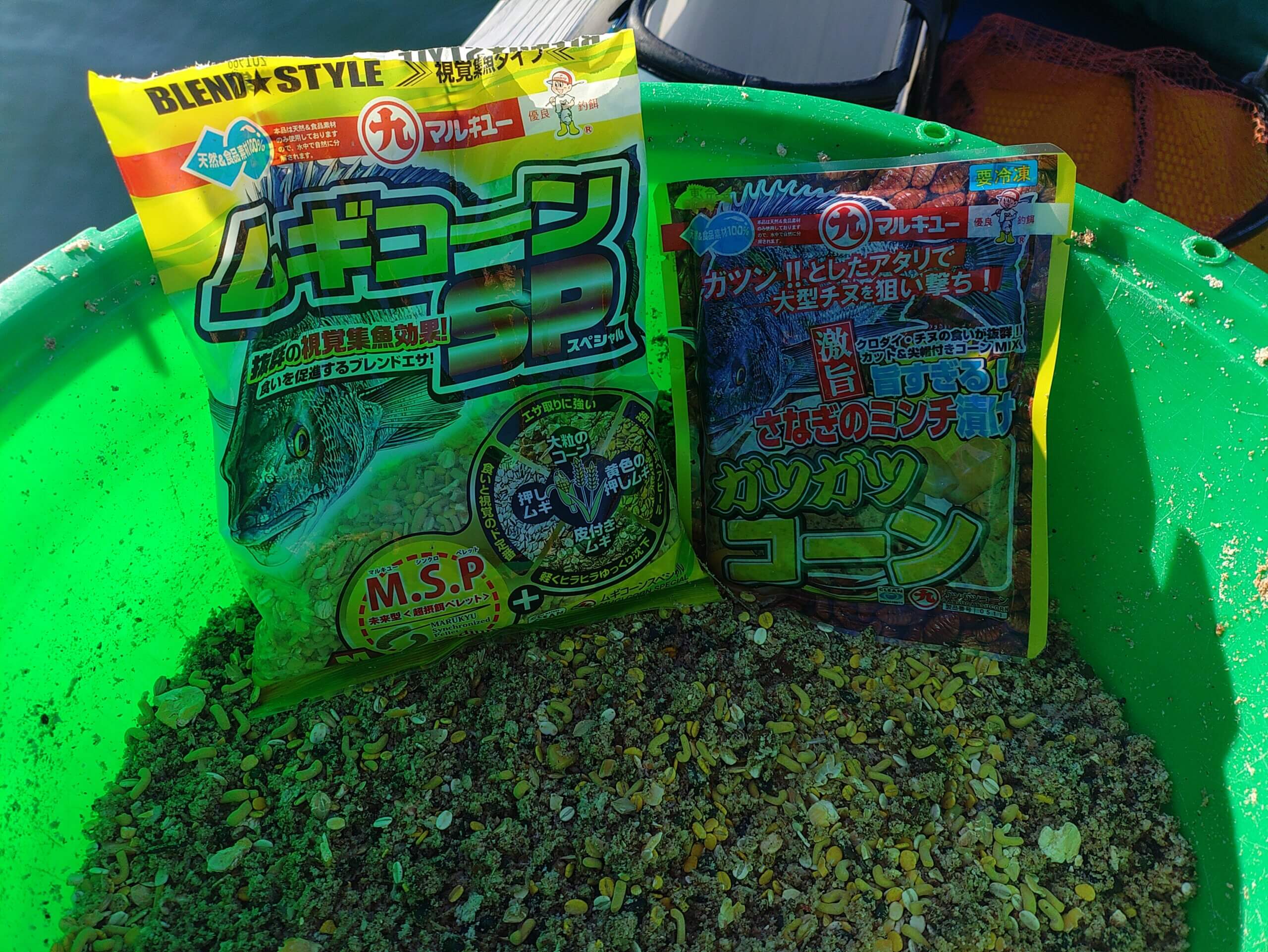 付けエサ:「ニューくわせコーン」 「ガツガツコーン」 「活丸さなぎ」 「くわせオキアミ食い込みイエロー」 「くわせオキアミスーパーハードBIGL」 「ニュー活さなぎミンチ激荒」