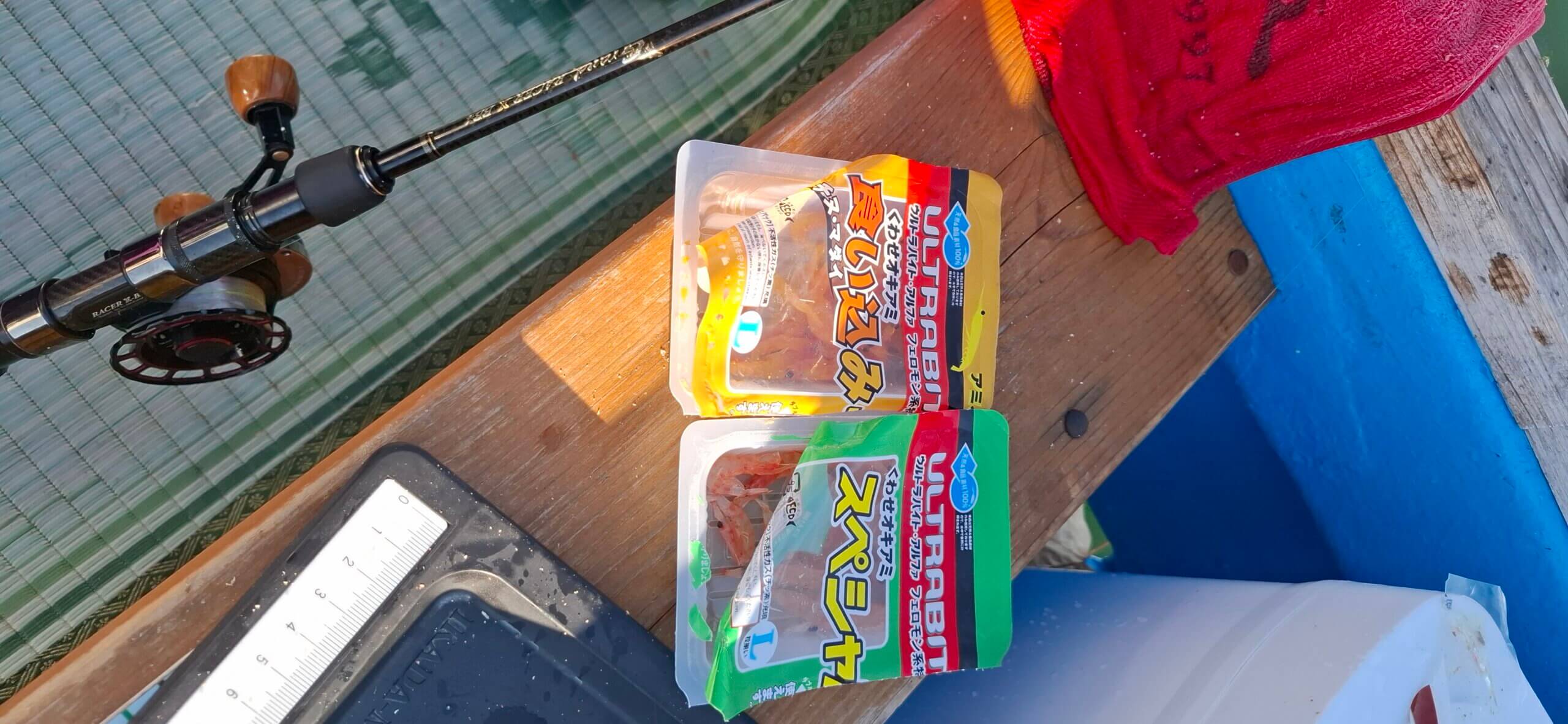 ヒットエサ:「くわせオキアミスペシャル(L)」 「くわせオキアミ食い込みイエロー」