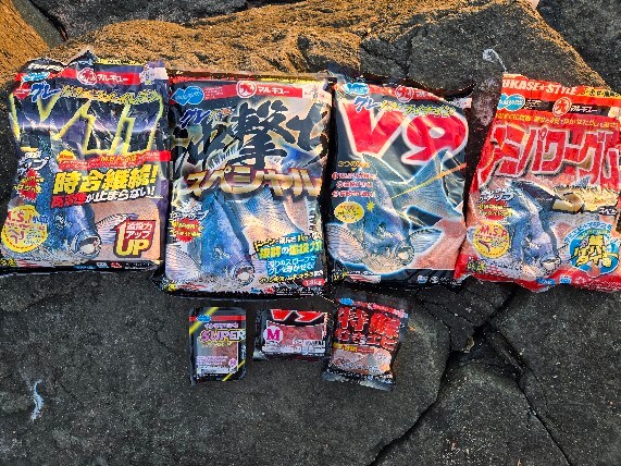 配合エサ:オキアミ3kg・「グレパワーV9」 と「ニューグレパワーV11」「グレパワー沖撃ちスペシャル」「アミパワーグレスペシャル」 各半分