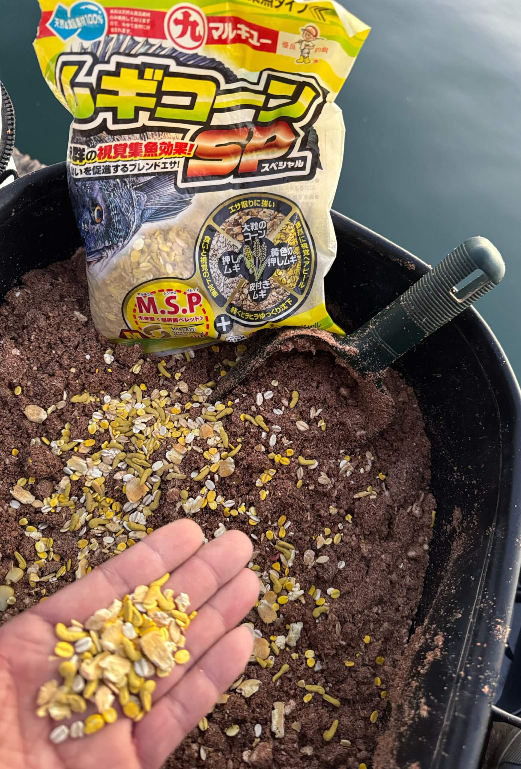 配合エサ:「ニュー赤だんごチヌ 」 「濁りオカラ」 「荒びきさなぎ(徳用)」 「コーンダンゴチヌ」 「ニュー活さなぎミンチ激荒」