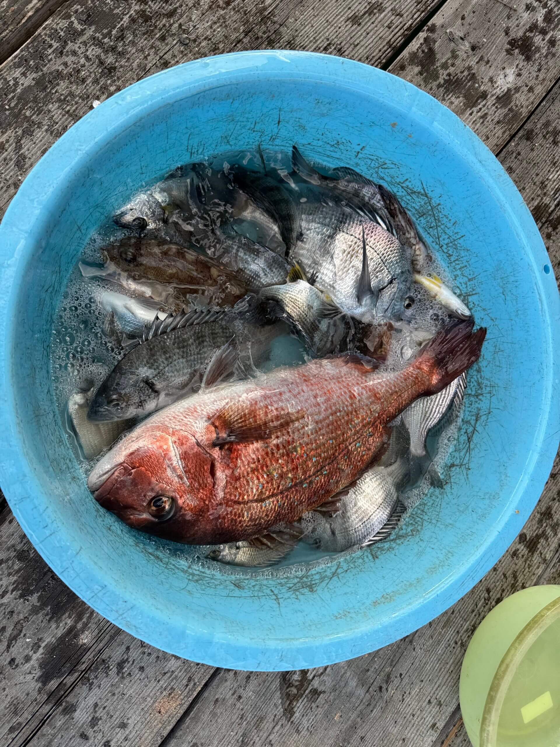 朝はエサ取りも居ない感じでの開始、1時間ほどしてフグ・シマイサキ・カサゴ・ヘダイが反応し出しポッポッとチヌが釣れ始めサイズは小さいですが楽しめました