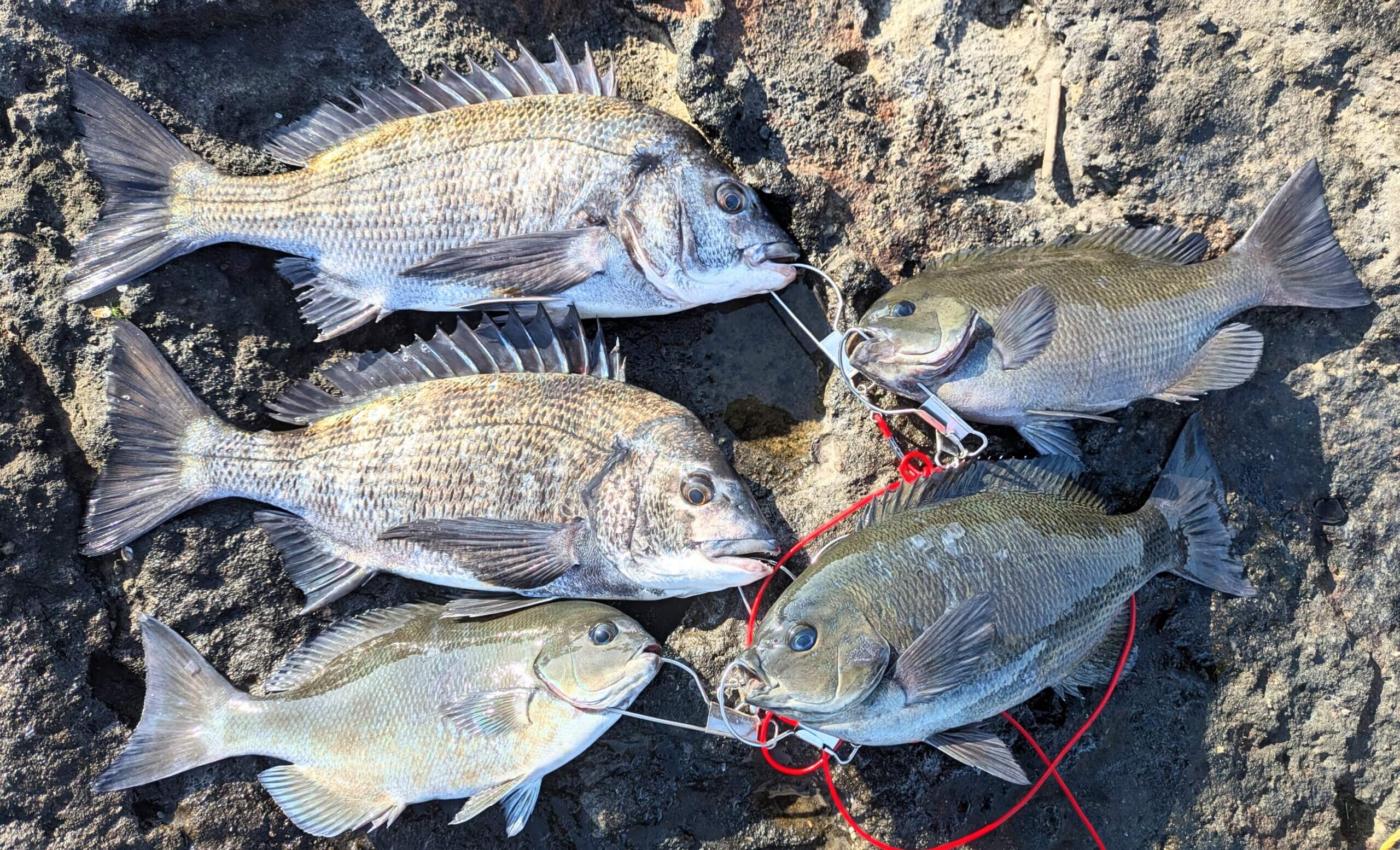 遠投釣りをやりたくなり、館山市内の地磯へ釣行。朝の下げ潮時が時合いとなり、クロダイの他にメジナもヒット!