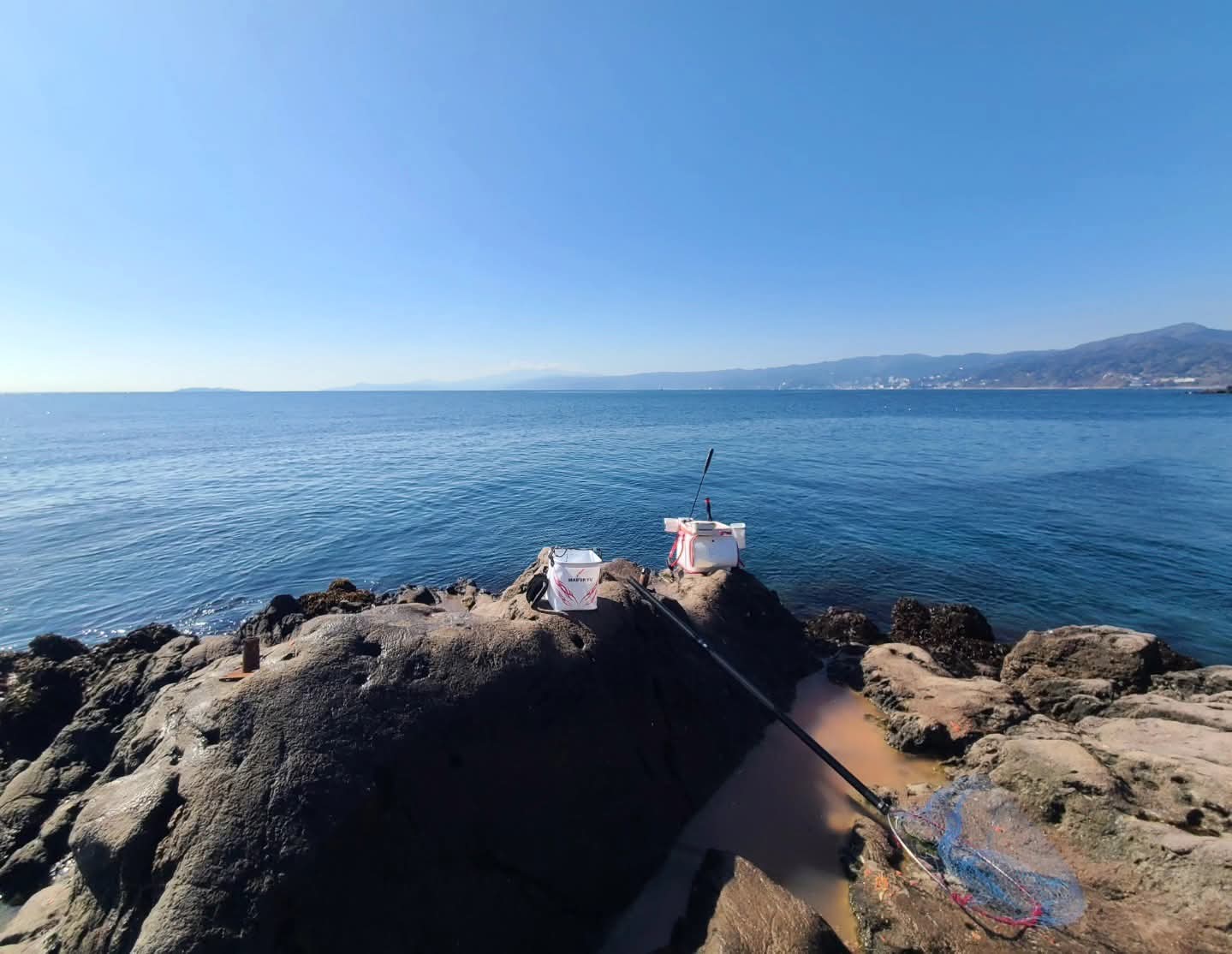 真鶴半島・地磯へ釣行してきました。潮の変化がほとんどなく付けエサが、そのまま帰ってくる時間が多かったですが、少しだけ潮が流れるとメジナが住み処から動き、口をつかってくれる状況でした。