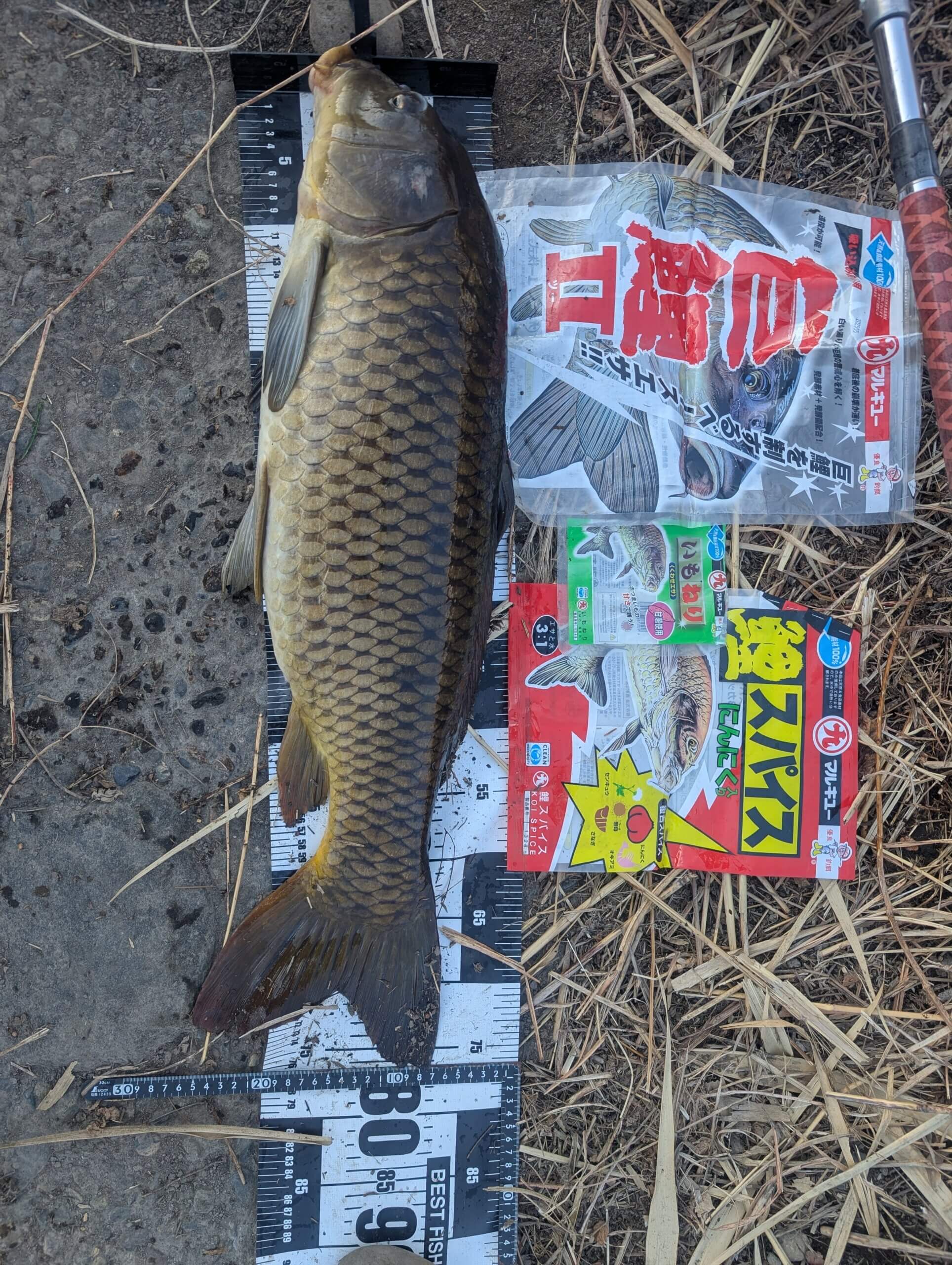 配合エサ:「巨鯉Ⅱ」「鯉スパイス」各一袋とニワトリの餌を配合。「巨鯉Ⅱ」は流れ中でも底に残ります。更に香りにインパクトを出す為「鯉スパイス」を混ぜると低水温のとき有効です。
