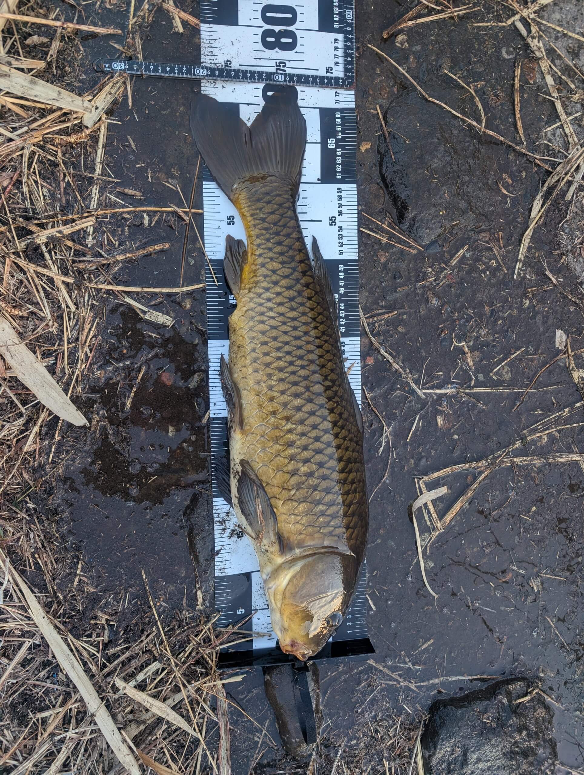 朝起きて段取りし釣り場向かうと風は強いが気温が高く水温も12~3℃あるが鯉の動きはイマイチ予報では午後は気温上昇となっているので竿をセット自作吸込みヘアリグ仕掛けに練りエサと食わせのいもねりをセレクトし竿先10メートル付近のカケアガリに投入し60分後アタリが有るがシャブリで乗らず気お取り直し同じポイントに仕掛けを投入2時間後アタリ下流方向に竿が曲がっているのを確認しやり取り開始し50m程走られ流れに逆らってのやり取り磯竿4号なので中々寄せられず大苦戦20分かかり76センチゲットその後2時間アタリ無しで終わりかな?と思い片付ける為車から降りた時センサーが反応し今度は上流方向に竿が曲がっているのでデカイと思い直ぐ様竿の所に行きやり取り開始したが鯉が下流方向に移動して来た為全然手応えが無くすんなりタモ入れし測ると72センチ良く言うのが上流に走る鯉は大きいと言われますが今回は期待ハズレでしたが半日で二匹の釣果で満足です。