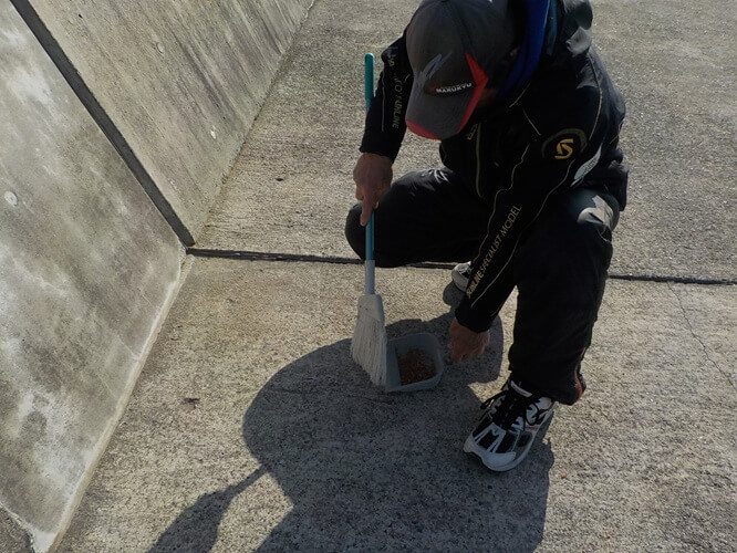 配合エサ:オキアミ1.5Kgに「ナンバー湾チヌⅡ」と「チヌスパイス」を混ぜあわせ、適量な海水でを入れ、 よく混ぜる。空気を抜いた後、ここで「チヌパワー」を投入。再度よく混ぜあわせた。