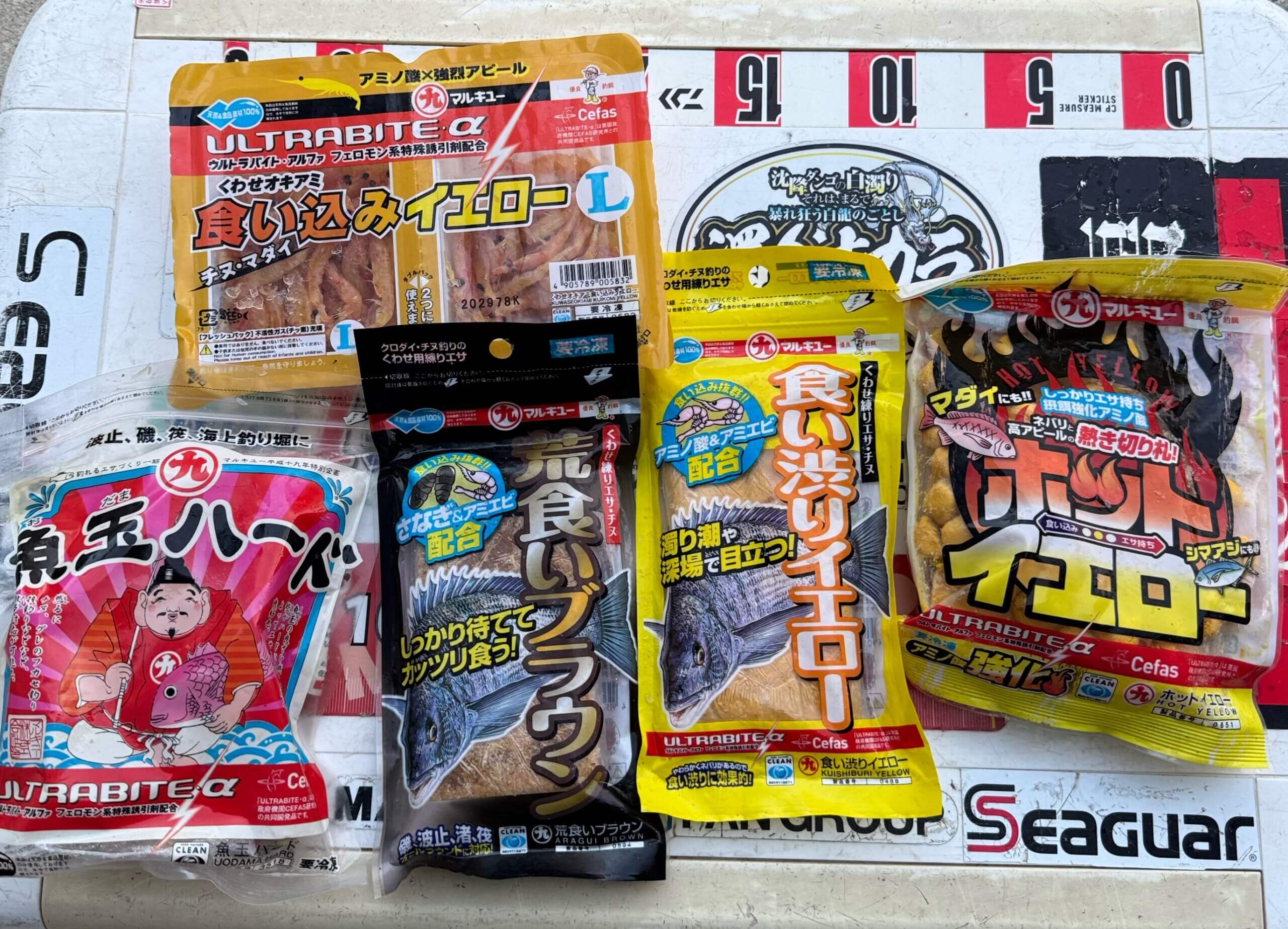 付けエサ:「くわせオキアミ食い込みイエロー」 「魚玉ハード」 「荒食いブラウン」 「ホットイエロー」 「食い渋りイエロー」 「パワーミニイソメ(極太)」