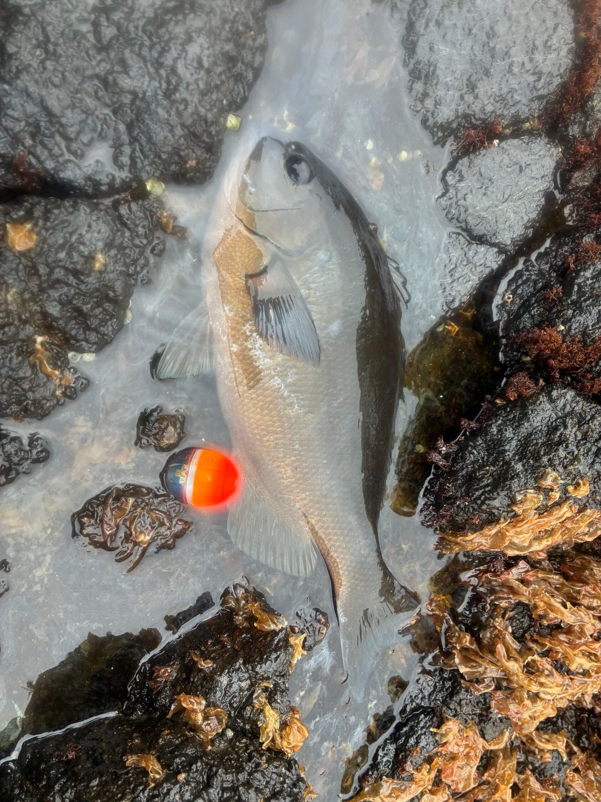 伊浜のワタリへ渡礁しました。この日は無潮で深く入れても掛かるのはタカノハダイやブダイ、ベラのみでグレの気配がなく時間が過ぎます。上り潮がトロリと流れてサラシとの合流点の泡へ仕掛けを深く入れるとやっと34㎝の尾長グレが食いました。このあと、さらに小さいサイズを2尾追釣してストップフィッシングとなりました。