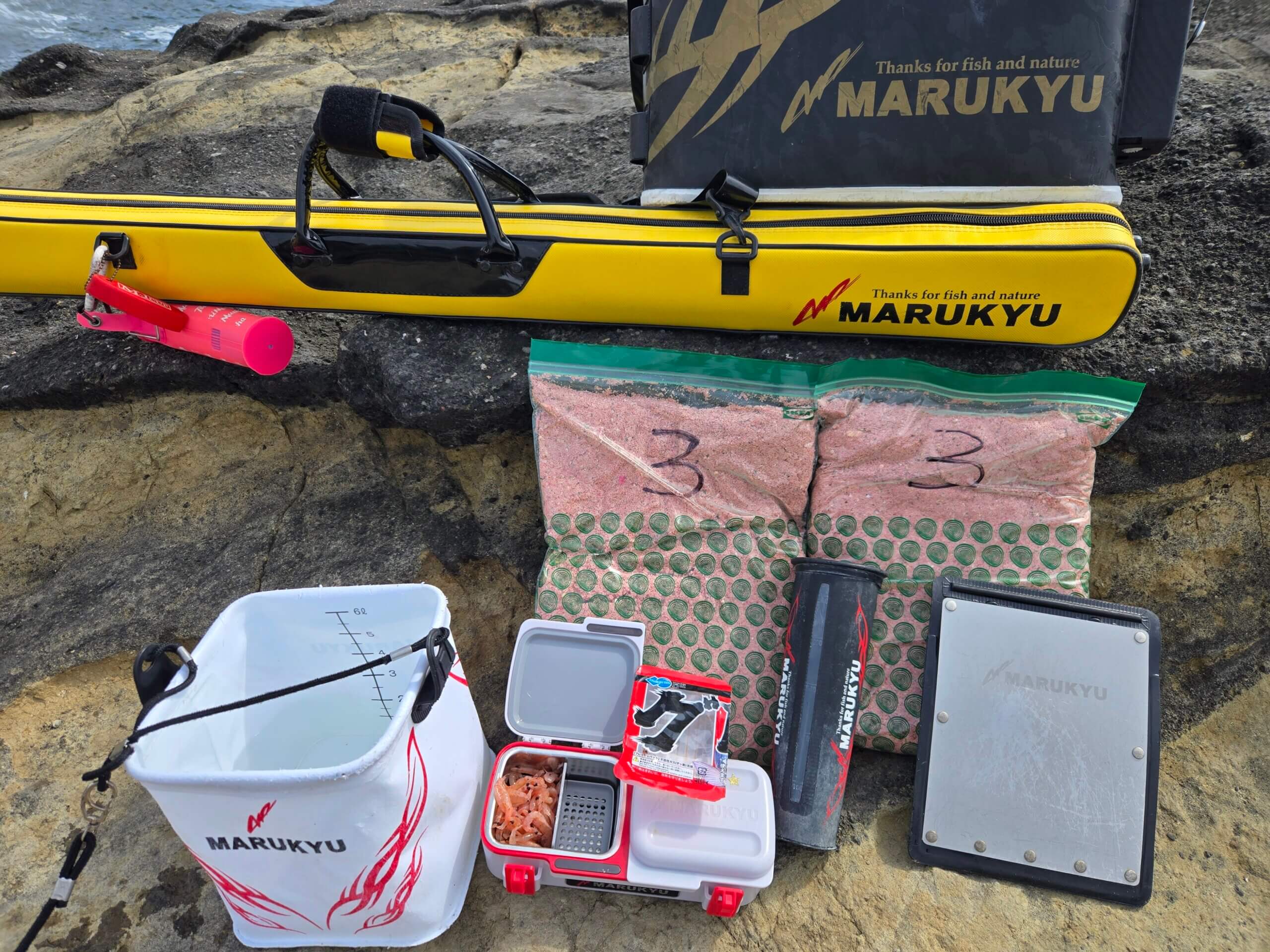 配合エサ:オキアミ6kg・「グレパワー沖撃ち S P」 「遠投ふかせT R」 「超遠投グレ」各1袋