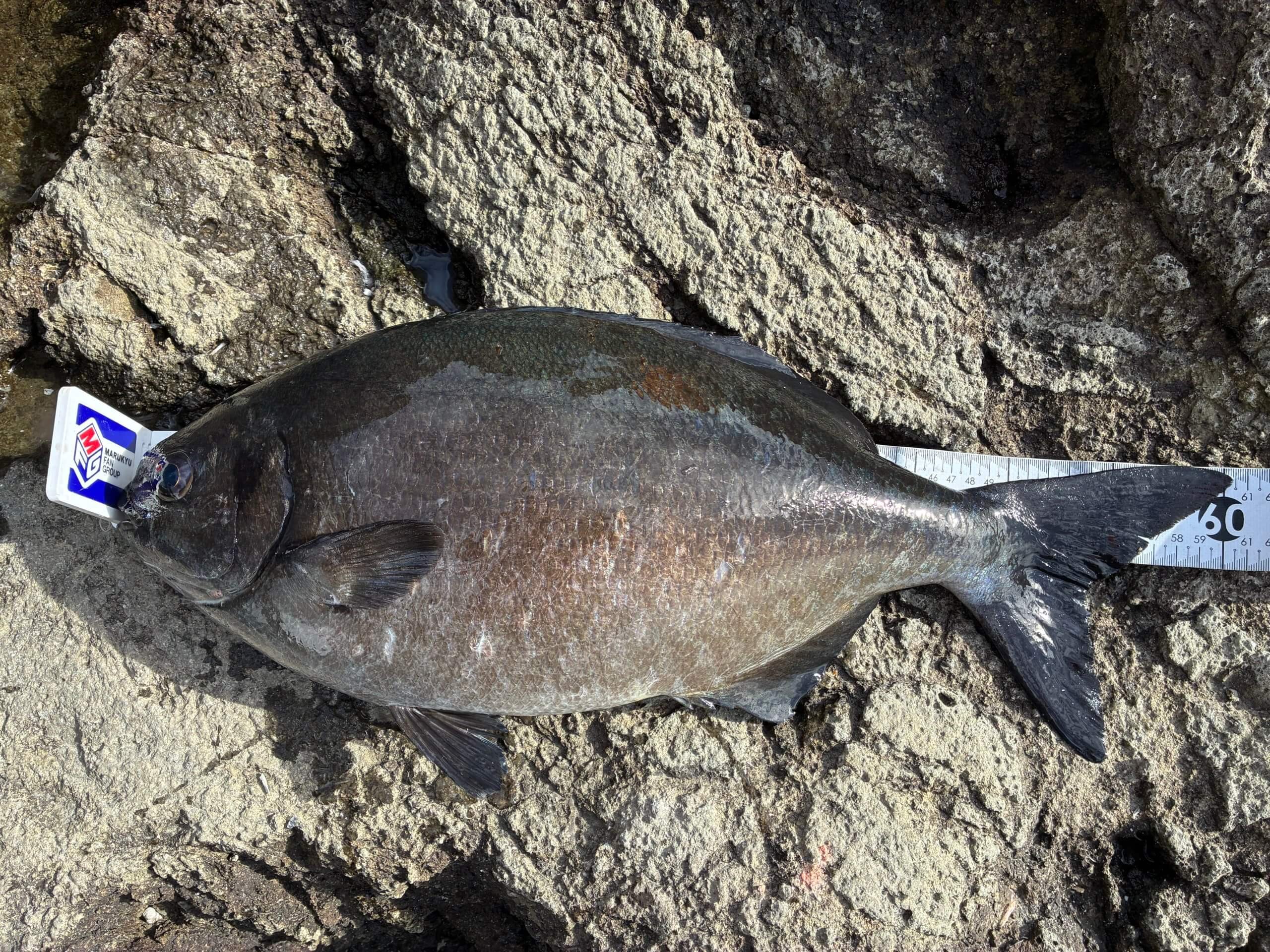 西伊豆の田子 三本表へ渡礁しました。ここのところ芳しい釣果が聞かれない西伊豆ですが50㎝オーバーもヒットしているので雨の中でも俄然やる気が入ります。上り潮が沖コブとの水道へと流れ始めた一瞬で、穂先がもたれるようなアタリ、エサ取りと思い仕掛けを回収しようとすると凄い重量感と引き、獲物の正体がわからないまま寄せて浮かせると、なんと50㎝近い口太グレ、完全に横になってましたが玉入れの時フワッと針ハズレ、めっちとゃ悔しいバラシでした。このあと無潮になり、磯際を攻めると今度はドでかいイズスミ、この日は2回だけの魚信で終わりました。