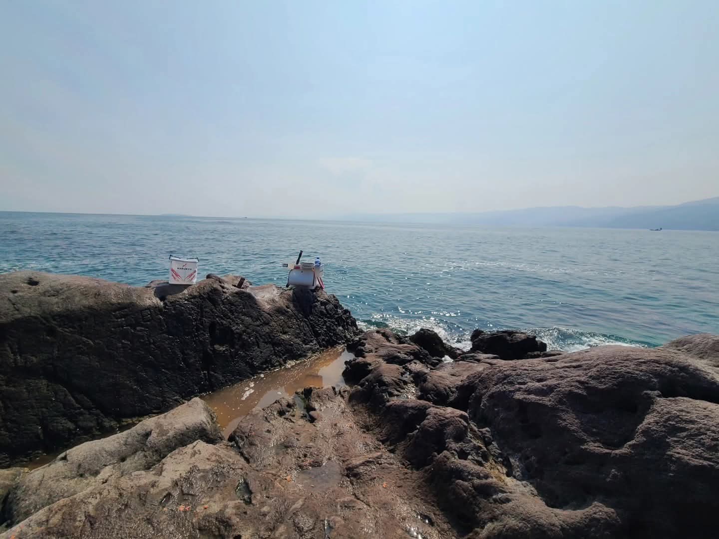 真鶴半島の地磯へ釣行してきました。潮は沖からの当て潮で三ッ石方向への流れで、潮色は暗く春の菜っ葉潮でした。