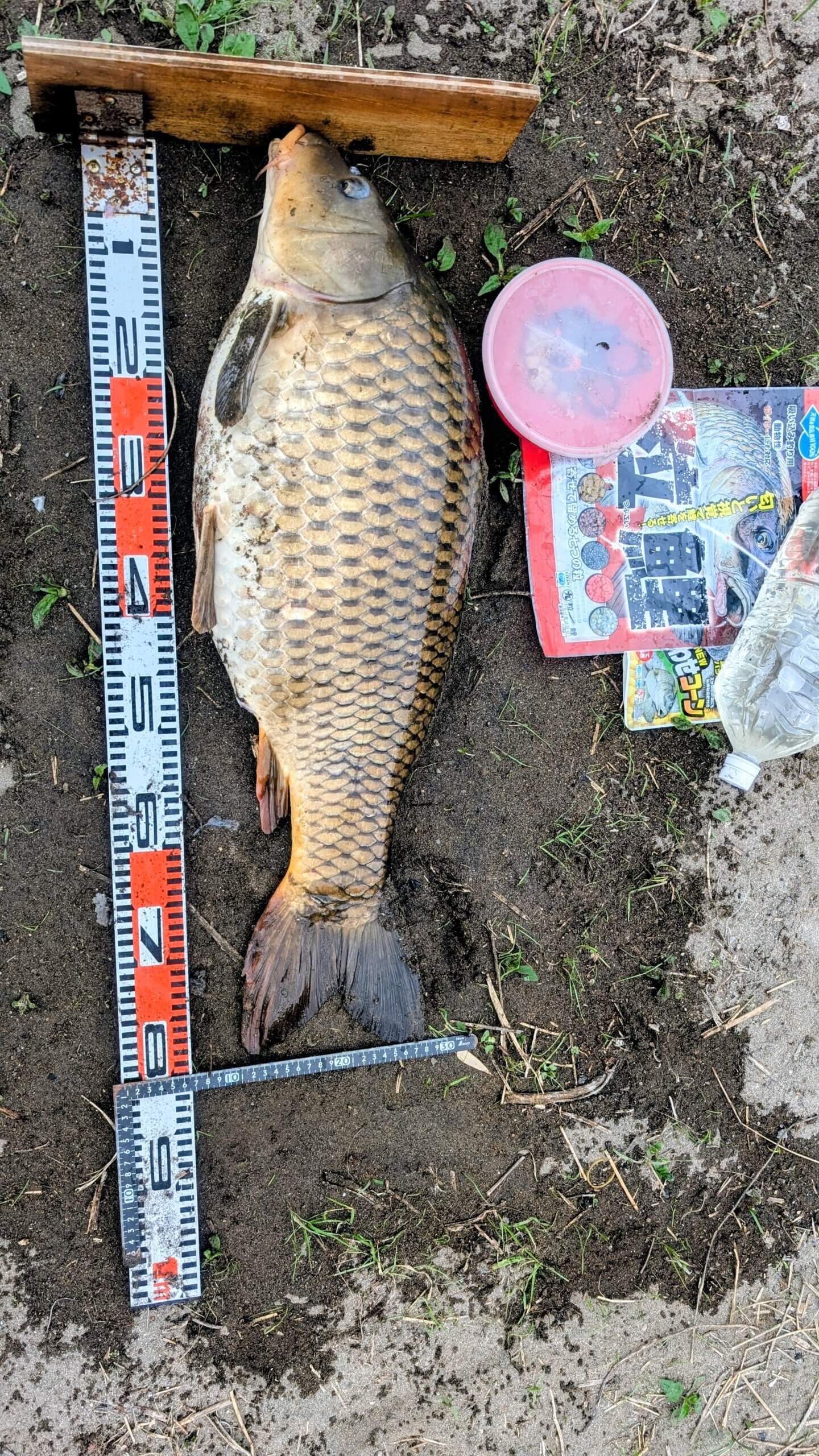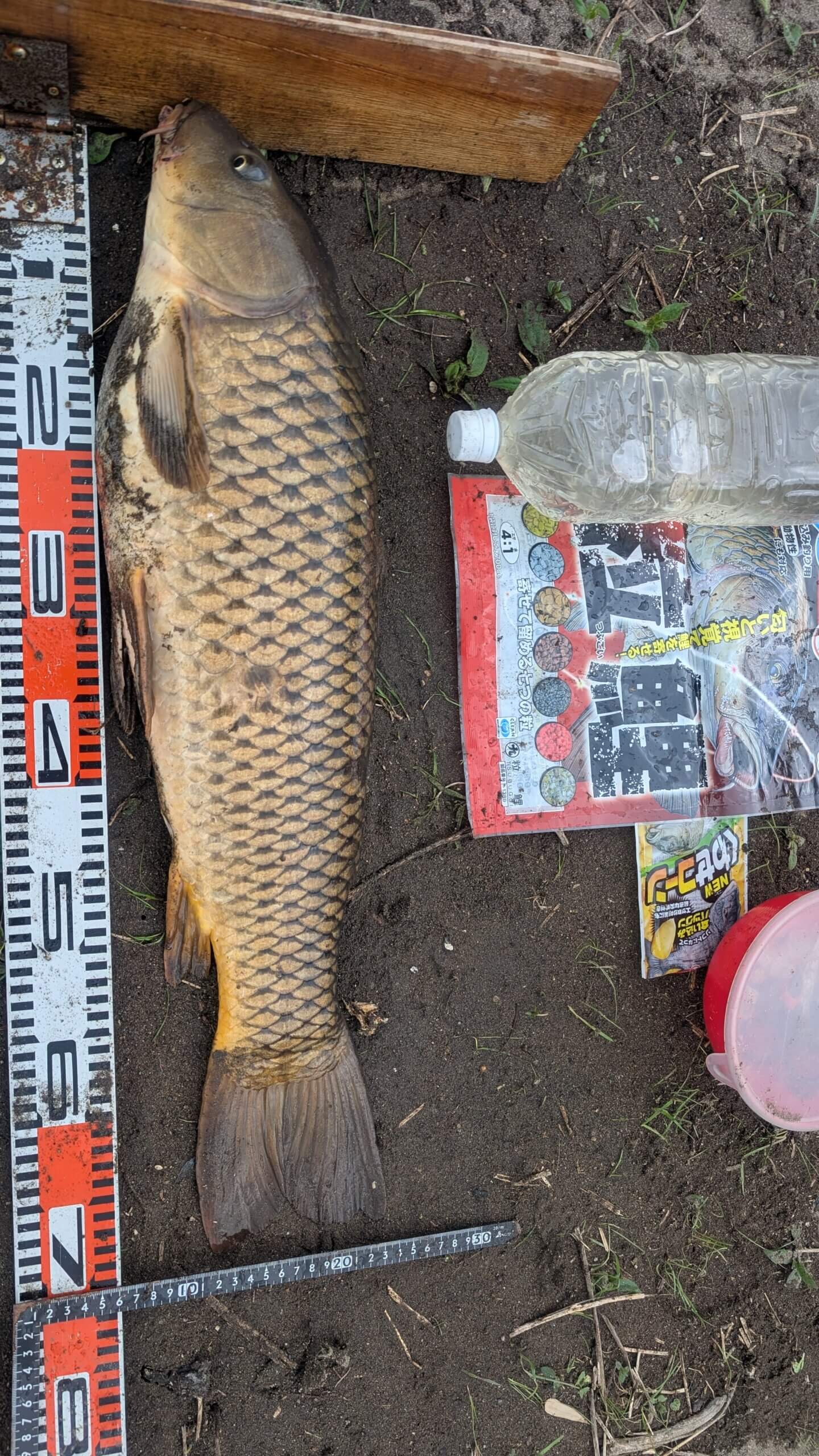 日曜2回アタリがあったがトラブルでバラシで納竿。そして今日仕事が午前中で終わったのでリベンジ11時半に竿をセット。自作吸込みに「粒鯉」をセレクト。食わせエサに「ニューくわせコーン」3粒セット。竿先3メートル付近が深くなり硬い土底。最初のアタリは13時過ぎに水深1.8mなので中々顔を出さない。10分程のやり取りで78センチゲット。そして次のアタリは今度は竿が曲がったままなので何処かに潜っているのかな?と思い竿持つといきなり下流に走り出し中々止まらない。ドラグを締め為の体勢に入り5分後今度は自分の方に戻って来て慌ててリールを巻き糸フケを取りやり取りを続けるが顔を出さない!15分位でヤット魚体が見えた体高のあるデブ鯉が川幅が狭いので走られると厄介なのでドラグを締め糸を出さず更に10分格闘しようやく大人しく成りタモ入れし陸に上げ計るとこの川の規模からすると大物81センチ9キロゲット。非常に楽しいやり取りでした。次に三尾目はレギュラーサイズの70センチ81センチのやり取りが豪快だったのでイマイチつまらないやり取りでした。