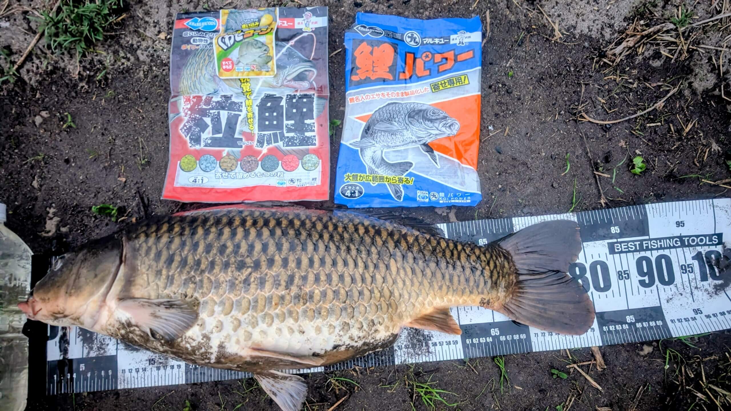配合エサ:「粒鯉」一袋を料理酒で練った物を使用し「鯉パワー」1袋を水で練った物を撒き餌として使用