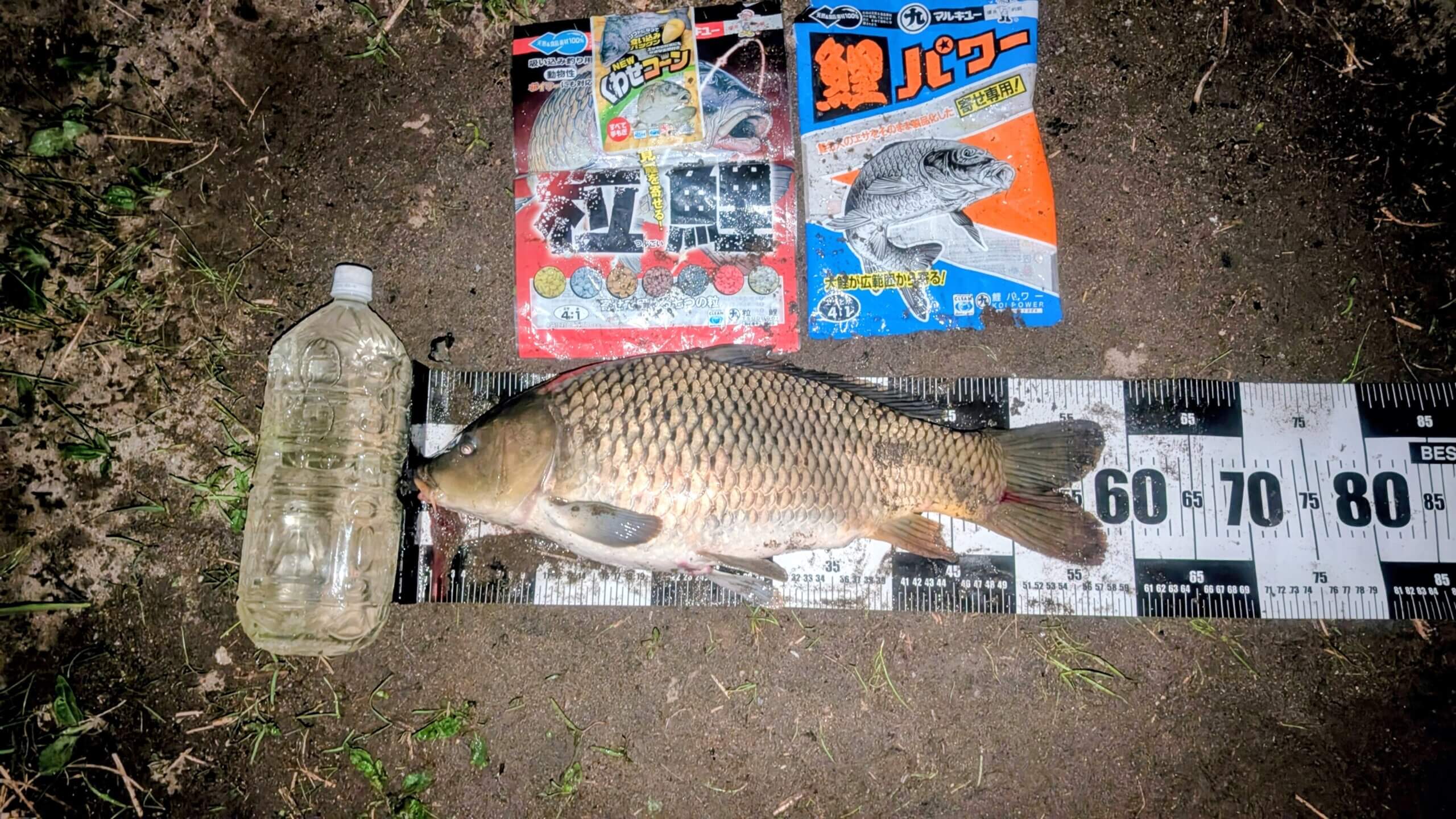 今週末は釣りが出来ないので17時釣りをスタート自作吸込み1本針仕掛けに「粒鯉」をセット。食わせ餌に「ニューくわせコーン」三粒ヘアリグにセットし竿先3メートルのポイントに投入撒き餌に「鯉パワー」を使用し60分後に80cmゲット。更に60分後にアタリやり取りするも1尾目より重くドラグを目一杯締めているのに糸が出る夜なのでヘッドライトの明かりが頼り視野が狭く掛かりに入られ痛恨のバラシ。姿は見えないがやり取りの感じからして1尾目より大きいと思われる?次に気を取り直し同じエサを仕掛けにセット。90分後に58cmゲット。その後アタリが止まり納竿。