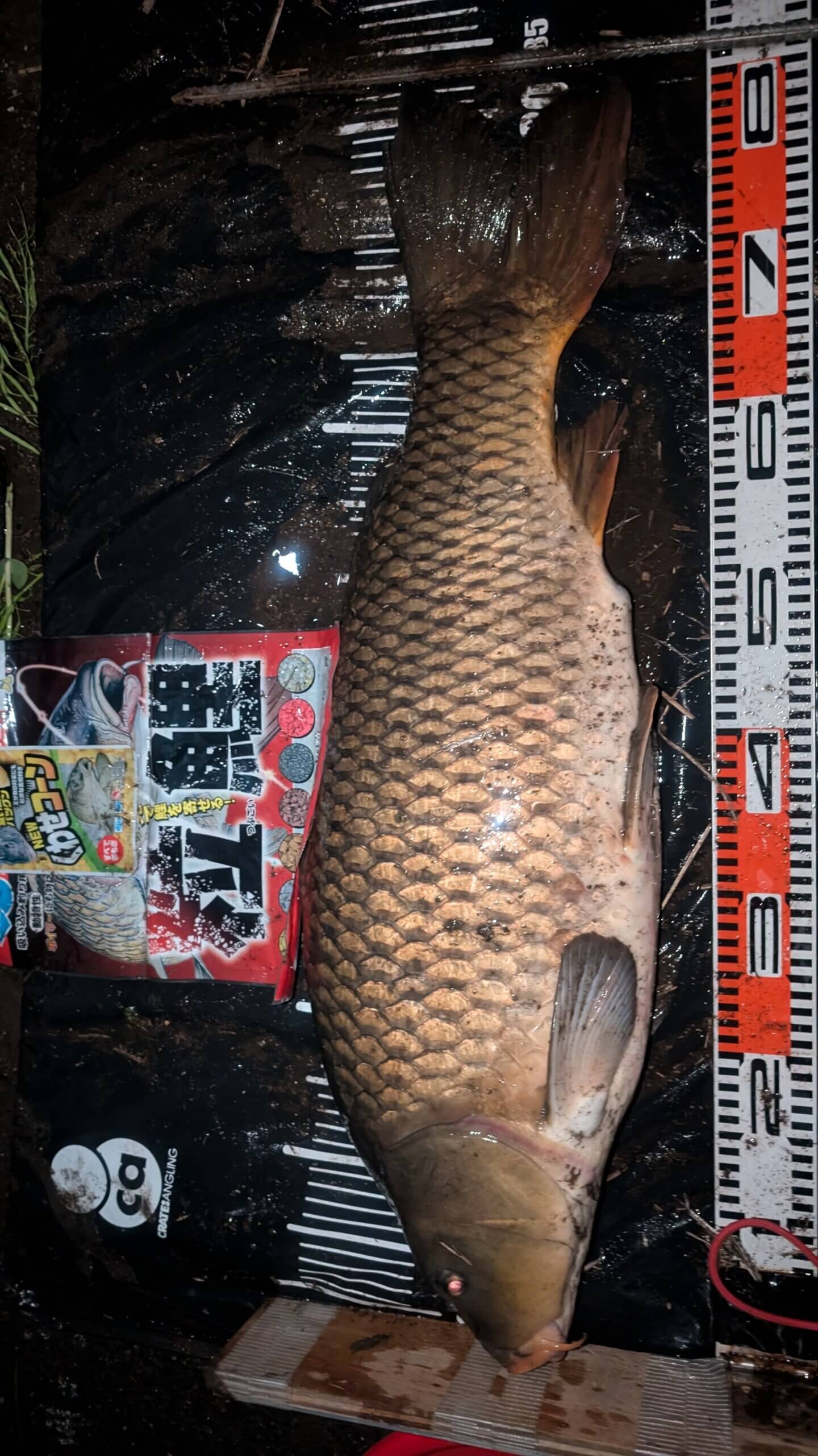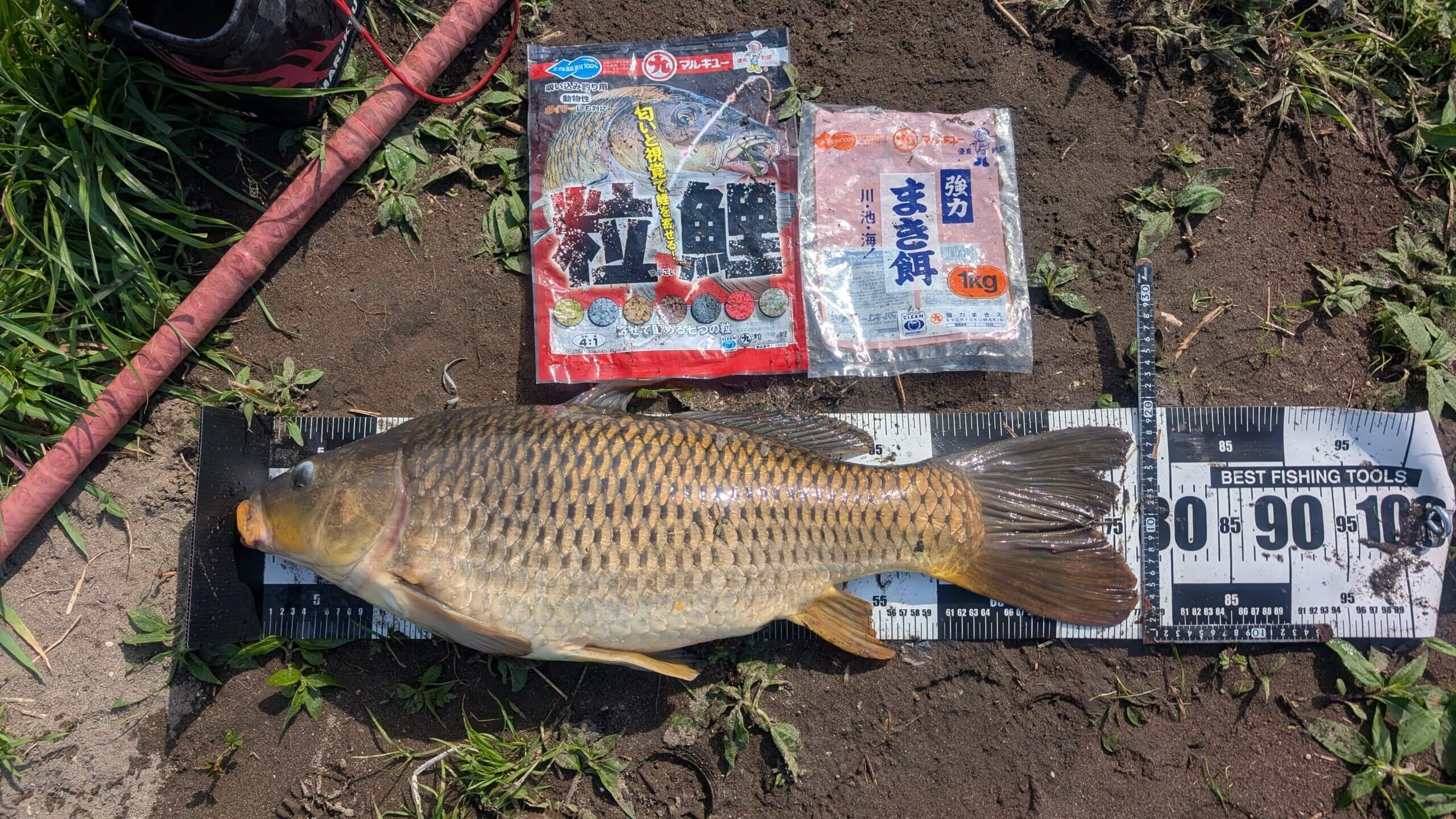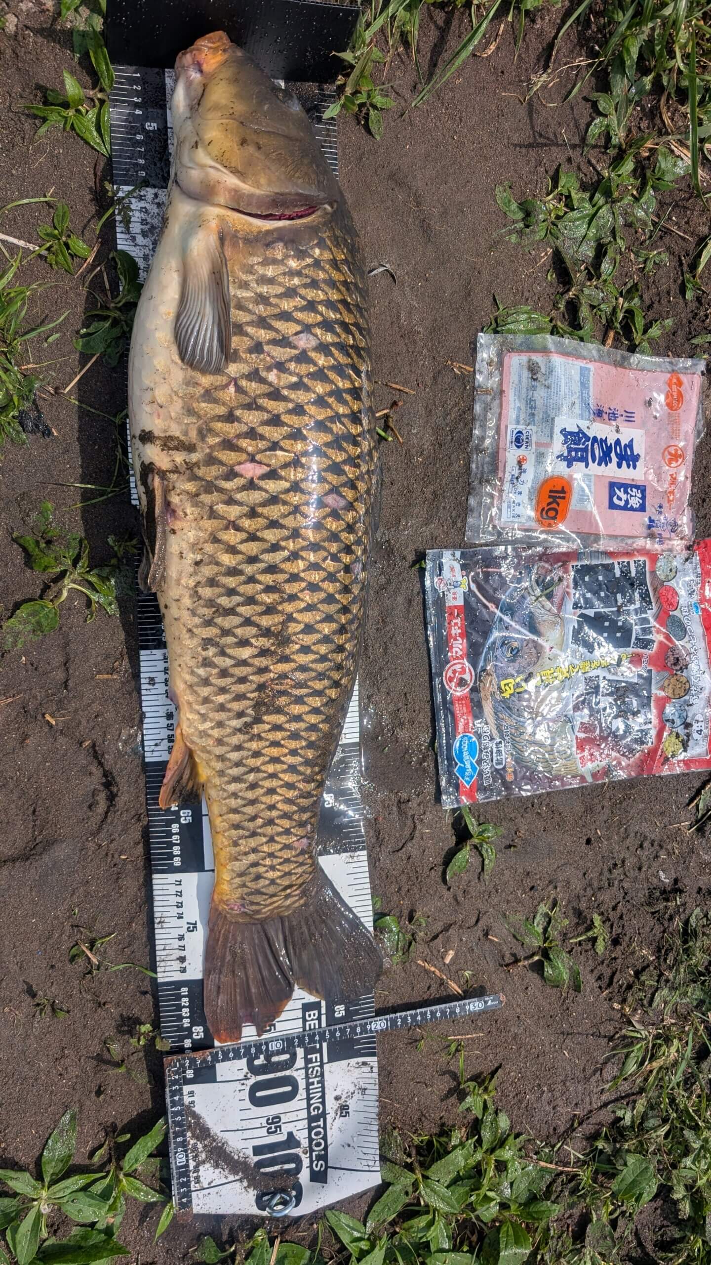 金曜の夕方に神沢川合流から50m上流のポイントに「粒鯉」をダンゴで5〜6個撒き餌をし合流地点にも「粒鯉」をダンコで5〜6個撒き餌をし一旦帰宅。翌朝8時に釣り場に行き釣行開始目の前の神沢川の撒き餌は全て無くなっていた。合流地点は水深が2m以上ある為撒き餌は確認出来ない。神沢川の方にも「粒鯉」をセレクトし食わせ餌に生サナギを2つちょん掛けし手前川岸付近水深1mに投入し90分後アシの影からこちらの姿が見えない位置様子を見ると餌の周りを2〜3尾餌を捕食している。釣れると確信し5分程で食付き一気に50m位下流に走りやり取り開始流れに逆らっての為手応え抜群しかもデブ鯉重く中々寄せられず10分程遊ばせやっと大人しくなりタモ入れ検量すると78cm9キロ。その後しばらくアタリ無し。合流地点の竿には全くアタリ無し。餌は「粒鯉」食わせ「いもねり」。お昼ご飯の仕度をしていると釣友が尋ねて来た。一尾釣れたがその後はアタリ無しと伝えると食わせ餌をボイリーにしてみたらと言うので13時に「粒鯉」を寄せエサに食わせエサボイリーをセット。更に「強力まきえ」を手掴みで2回撒き餌したら投入ご30分でアタリ、野鯉系の86cm9.5キロゲット。その後も77cm9キロと釣れたのでアタリが続くと思い餌を投入。夕方になってもアタリ無し。食わせ餌を「いもねり」やコーン、ボイリーを15ミリと小さくしたり試行錯誤を繰り返すが日曜の納竿の16時までアタリ無し。神沢川の方は朝のやり取りで場荒れしたらしく8時間アタリし全く鯉がいない。確か前日も餌撒きに来た時も鯉の姿は無かった恐らく夜から朝までの間に荒砥川から神沢川に入ってきて自分が撒いた餌を捕食し荒砥川に帰るパターンになっているようだ。と言う事は夜になれば香りに吊られ荒砥川から上がって来ると思い昼間使用した「強力まきえ」が半分残っていたので全部撒き餌し吸込みに「粒鯉」をセット。食わせ餌に「ニューくわせコーン」を3粒ヘアリグにセットし朝と同じ所に投入し19時半待望のアタリ。一気に下流に走るドラグを締めても糸が出る下に降りやり取り開始。朝の魚より重く夜なので視界がライトの範囲内しかの為思い切りドラグを締めリールをやや強引巻く50m付近に竹が倒れ川幅のほとんどを塞いでいる為強引なやり取りでその場から離さないとバレてしまうからである。鯉もその場から下には行けないと判断し自分に向かって動き出したので素早く糸を巻き近くに寄せて見ると80cmは有る魚体朝と同じくデブ鯉タモに入れ上にあげ検量81cm9キロ。やはり場荒れしたらしく12時間後の日曜朝8時になってもアタル気配なし。昨日10時半に釣れたのでその時間に合わせ打ち直し夜と同じく「粒鯉」をセット食わせ餌に「ニューくわせコーン」をセットし投入ほぼ予想どうり10時10分過ぎ待つ事15時間半待ちに待ったアタリセンサーの音目の前の竿が下流方向に曲がり勢い良く糸が出る竿を持ちやり取り開始したがしかし!!食い込みが甘くバレてしまった!今日はダメかなと思いながらダメ元で同じ餌同じ食わせ更に追加で「強力まきえ」一袋全部を撒き餌した。午後になると70〜80cmクラスが3〜4尾餌の周りをうろついているが中々本命に食い付かない。車に戻りTV見ているとアタリセンサーが反応し同じく勢い良く糸が出るやり取りするが何か軽い余裕でタモ入れ小柄な60cmでもデブ鯉納竿しようと川を見ると「強力まきえ」が底に残っている薄濁りの為何尾居るのか確認出来ないが餌を捕食している姿がある。「粒鯉」と「ニュースくわせコーン」をセットし着水音を小さくする為サイドスローで投入しばらくして先程いた鯉の群れが餌を見つけ本命に食い付き一気に下流に走るバレない様慎重なやり取りで手前に寄せ口を見ると上口ビルの硬い所に針掛かりしているので絶対バレ無いと確信し強引にタモ入れ検量80cmジャスト9.5キロののデブ鯉ゲットで納竿。